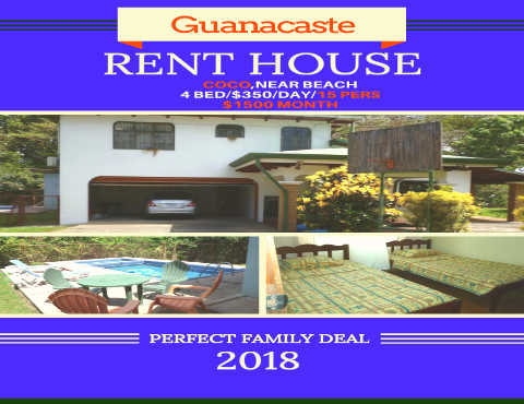 Guanacaste RENT HOUSE COCO,NEAR BEACH 4 BED/$350/DAY/15 PERS $1500 MONTH PERFECT FAMILY DEAL 2018