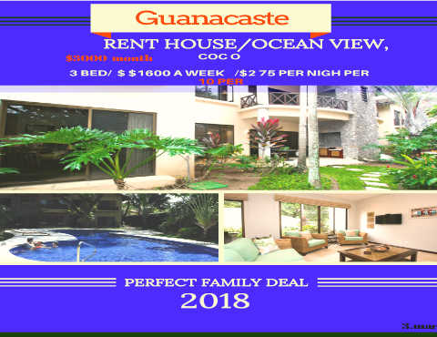 Guanacaste RENT HOUSE/OCEAN VIEW, $3000 month COC O 3 BED/ $ $1600 A WEEK /$2 75 PER NIGH PER 10 PER PERFECT FAMILY DEAL 2018 3.mar