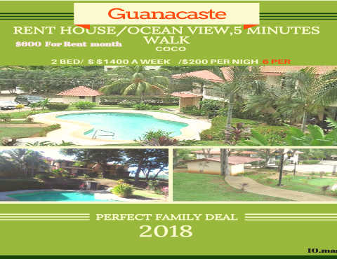 Guanacaste RENT HOUSE/OCEAN VIEW,5 MINUTES WALK $600 For Rent month COCO 2 BED/ $ $1400 A WEEK /$200 PER NIGH 6 PER PERFECT FAMILY DEAL 2018 10.mar
