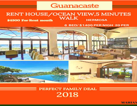 Guanacaste RENT HOUSE/OCEAN VIEW,5 MINUTES WALK $4500 For Rent month HERMOSA 6 BED/ $1400 PER NIGH 20 PER PERFECT FAMILY DEAL 2018 MARIAN