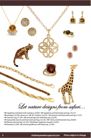18K pendant, $2,785, shown on 18K 30” necklace. $2,275; 14K Garnets and Diamonds earrings, $1,275; 14K Garnets ring, $1,795; 18K enamel tiger pin with Ruby eye, $2,250;