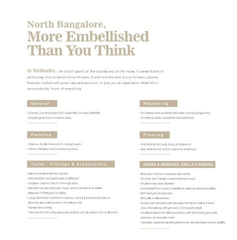 technology and construction techniques, found nowhere else, but at Ajmera Lugaano. • Each flat will be provided with adequate BESCOM power i.e., 2 to 3 KW.
