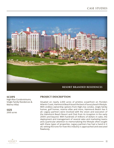 Situated on nearly 2,000 acres of pristine oceanfront on Florida’s Atlantic Coast, Hammock Beach boast the best of luxury beach lifestyle. With endless ownership options from High-rise condos, single family homes, golf homes, marina villas and more, Hammock Beach has it all. Legacy partners were involved with the vision and execution of the Hammock Beach Resort and Club from its inception in the early 2000’s and beyond. With hundreds of millions of dollars in sales, the deployment and management of several sales and marketing teams and a particular attention to memorializing the lifestyle often sought with these types of properties, Legacy partners has had a hand in it all; setting the tone for how this industry is approached and executed awlessly.