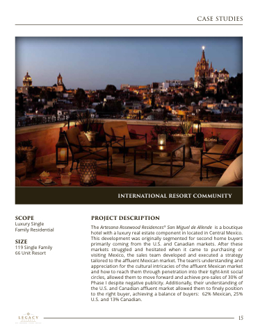 The Artesana Rosewood Residences® San Miguel de Allende is a boutique hotel with a luxury real estate component in located in Central Mexico. This development was originally segmented for second home buyers primarily coming from the U.S. and Canadian markets. After these markets struggled and hesitated when it came to purchasing or visiting Mexico, the sales team developed and executed a strategy tailored to the a uent Mexican market. The team’s understanding and appreciation for the cultural intricacies of the a uent Mexican market and how to reach them through penetration into their tight-knit social circles, allowed them to move forward and achieve pre-sales of 30% of Phase I despite negative publicity. Additionally, their understanding of the U.S. and Canadian a uent market allowed them to nely position to the right buyer, achieving a balance of buyers: 62% Mexican, 25% U.S. and 13% Canadian.