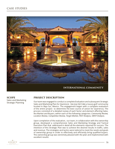 Our team was engaged to conduct a complete Evaluation and subsequent Strategic Sales and Marketing Plan for Querencia - San Jose Del Cabo a luxury golf community located in Baja Sur, Mexico. The engagement began with a complete evaluation of the entire project to determine the best course of action for Querencia. The process consisted of a detailed review of each factor and element a ecting Sales, the Market and Buyers, within each of the following categories: Community Review, Location Review, Competitive Review, Target Market, PEST Analysis, SWOT Analysis.