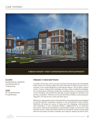 With prices anticipated to start in the low $300s, this development was designed to provide e cient residential solutions in the thriving East Austin market. Residents will enjoy the luxury of living near the shopping, entertainment and restaurants in the renowned Mueller neighborhood at an attractive price point. Horizontal development is projected to begin construction in the Summer of 2019. Sales reservations will be converted to contract in early 2020 with the rst phase of homes complete and ready for delivery by Fall of 2020.