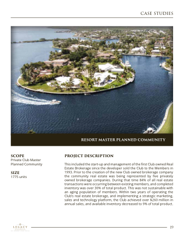 This included the start-up and management of the rst Club owned Real Estate Brokerage since the developer sold the Club to the Members in 1993. Prior to the creation of the new Club owned brokerage company the community real estate was being represented by ve privately owned brokerage companies. During that time 84% of all real estate transactions were occurring between existing members, and completed inventory was over 30% of total product. This was not sustainable with an aging population of members. Within two years of operating the Club’s real estate brokerage, and implementing a strategic marketing, sales and technology platform, the Club achieved over $260 million in annual sales, and available inventory decreased to 9% of total product.