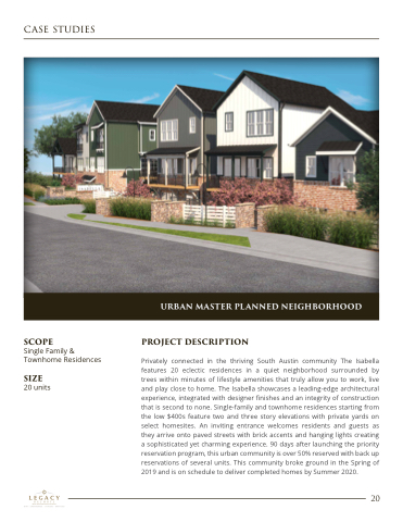 Privately connected in the thriving South Austin community The Isabella features 20 eclectic residences in a quiet neighborhood surrounded by trees within minutes of lifestyle amenities that truly allow you to work, live and play close to home. The Isabella showcases a leading-edge architectural experience, integrated with designer nishes and an integrity of construction that is second to none. Single-family and townhome residences starting from the low $400s feature two and three story elevations with private yards on select homesites. An inviting entrance welcomes residents and guests as they arrive onto paved streets with brick accents and hanging lights creating a sophisticated yet charming experience. 90 days after launching the priority reservation program, this urban community is over 50% reserved with back up reservations of several units. This community broke ground in the Spring of 2019 and is on schedule to deliver completed homes by Summer 2020.