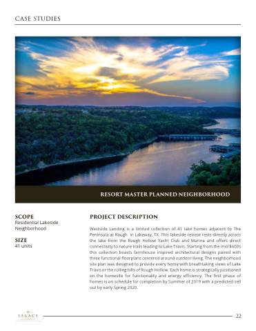 Westside Landing is a limited collection of 41 lake homes adjacent to The Peninsula at Rough in Lakeway, TX. This lakeside retreat rests directly across the lake from the Rough Hollow Yacht Club and Marina and o ers direct connectivity to nature trails leading to Lake Travis. Starting from the mid $600s this collection boasts farmhouse inspired architectural designs paired with three functional oorplans centered around outdoor living. The neighborhood site plan was designed to provide every home with breathtaking views of Lake Travis or the rolling hills of Rough Hollow. Each home is strategically positioned on the homesite for functionality and energy e ciency. The rst phase of homes is on schedule for completion by Summer of 2019 with a predicted sell out by early Spring 2020.