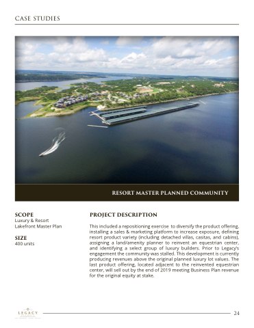This included a repositioning exercise to diversify the product o ering, installing a sales & marketing platform to increase exposure, de ning resort product variety (including detached villas, casitas, and cabins), assigning a land/amenity planner to reinvent an equestrian center, and identifying a select group of luxury builders. Prior to Legacy’s engagement the community was stalled. This development is currently producing revenues above the original planned luxury lot values. The last product o ering, located adjacent to the reinvented equestrian center, will sell out by the end of 2019 meeting Business Plan revenue for the original equity at stake.