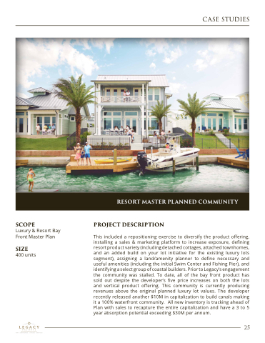 This included a repositioning exercise to diversify the product o ering, installing a sales & marketing platform to increase exposure, de ning resort product variety (including detached cottages, attached townhomes, and an added build on your lot initiative for the existing luxury lots segment), assigning a land/amenity planner to de ne necessary and useful amenities (including the initial Swim Center and Fishing Pier), and identifying a select group of coastal builders. Prior to Legacy’s engagement the community was stalled. To date, all of the bay front product has sold out despite the developer’s ve price increases on both the lots and vertical product o ering. This community is currently producing revenues above the original planned luxury lot values. The developer recently released another $10M in capitalization to build canals making it a 100% waterfront community. All new inventory is tracking ahead of Plan with sales to recapture the entire capitalization and have a 3 to 5 year absorption potential exceeding $30M per annum.