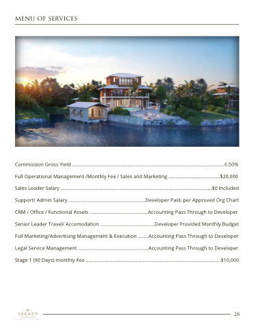 Commission Gross Yield ...................................................................................................................6.50% Full Operational Management /Monthly Fee / Sales and Marketing .......................................$20,000 Sales Leader Salary ..................................................................................................................$0 Included Support/ Admin Salary ..........................................................Developer Paid, per Approved Org Chart CRM / O ce / Functional Assets ............................................Accounting Pass Through to Developer Senior Leader Travel/ Accomodation .........................................Developer Provided Monthly Budget Full Marketing/Advertising Management & Execution ........Accounting Pass Through to Developer Legal Service Management .....................................................Accounting Pass Through to Developer Stage 1 (90 Days) monthly Fee ......................................................................................................$10,000