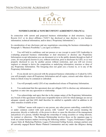 6. “Affiliate” means with respect to any person, any other person controlling, controlled by or under common control with such person, with “control” for such person meaning the possession, directly or indirectly, of the power to direct or cause the direction of the management and policies of a person, whether through the ownership of voting securities or voting interests, by contract or otherwise. The Business Relationship involves those on the signature page to work on certain business matters involving the following entities: “Legacy Performance Capital, Legacy Sales & Marketing Platform, Legacy Professional Selling System, strategic partners and all currently engaged Resort Master Planned Communities and any under due diligence during