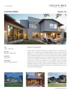 Legacy o ers custom home clients the opportunity to create luxurious spaces from the ground up, bringing individual style, innovation, and elegance to suit the clients vision and dreams. Every home is Energy Star certi ed and meets the most strict construction standards veri ed by third party inspection teams. Our professional team has expertise in every area of property development and throughout the construction process we commit our attention to the smallest details, including architecture, eco-friendly project planning, design coordination, and building. Legacy has built custom homes throughout the Austin area with styles ranging from Modern Farmhouse to Colorado Cabin in every shape and size imaginable.