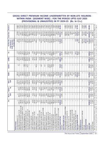 GROSS DIRECT PREMIUM INCOME UNDERWRITTEN BY NON-LIFE INSURERS WITHIN INDIA (SEGMENT WISE) : FOR THE PERIOD UPTO JULY 2025 (PROVISIONAL & UNAUDITED) IN FY 2024-25 (Rs. In Crs.) The Insurance Times September 2025 53