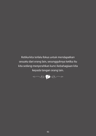 Ketika kita terlalu fokus untuk mendapatkan sesuatu dari orang lain, sesungguhnya ketika itu kita sedang menyerahkan kunci kebahagiaan kita kepada tangan orang lain. 95