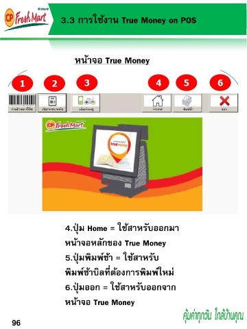 3.3 กำรใช้งำน True Money on POS หน้ำจอ True Money 4.ปุ่ ม Home = ใช้สำหรับออกมำ หน้ำจอหลักของ True Money 5.ปุ่ มพิมพ์ซ้ำ = ใช้สำหรับ พิมพ์ซ้ำบิลที่ต้องกำรพิมพ์ใหม่ 6.ปุ่ มออก = ใช้สำหรับออกจำก หน้ำจอ True Money 96