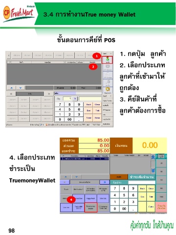 3.4 กำรท ำงำนTrue money Wallet ขั้นตอนกำรคีย์ที่ POS 1. กดปุ่ ม “ลูกค้ำ” 2. เลือกประเภท ลูกค้ำที่เข้ำมำให้ ถูกต้อง 3. คีย์สินค้ำที่ ลูกค้ำต้องกำรซื้ อ 4. เลือกประเภท ช ำระเป็น TruemoneyWallet 98
