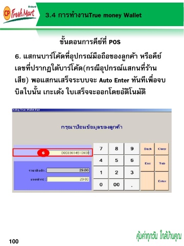 3.4 กำรท ำงำนTrue money Wallet ขั้นตอนกำรคีย์ที่ POS 6. แสกนบำร์โค้ดที่อุปกรณ์มือถือของลูกค้ำ หรือคีย์ เลขที่ปรำกฎใต้บำร์โค้ด(กรณีอุปกรณ์แสกนที่ร้ำน เสีย) พอแสกนเสร็จระบบจะ Auto Enter ทันทีเพื่อจบ บิลใบนั้น เกะเด้ง ใบเสร็จจะออกโดยอัติโนมัติ 100