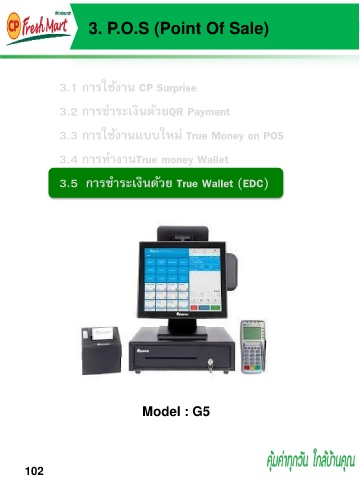 3. P.O.S (Point Of Sale) 3.1 กำรใช้งำน CP Surprise 3.2 กำรช ำระเงินด้วยQR Payment 3.3 กำรใช้งำนแบบใหม่ True Money on POS 3.4 กำรท ำงำนTrue money Wallet 3.5 กำรช ำระเงินด้วย True Wallet (EDC) Model : G5 102