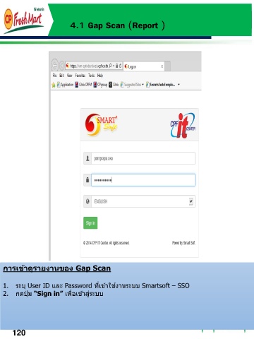 4.1 Gap Scan (Report ) การเข้าดูรายงานของ Gap Scan 1. ระบุ User ID และ Password ที่เข ้าใช ้ งานระบบ Smartsoft – SSO 2. กดปุ่ ม “Sign in” เพื่อเข ้าสู่ระบบ 125 120