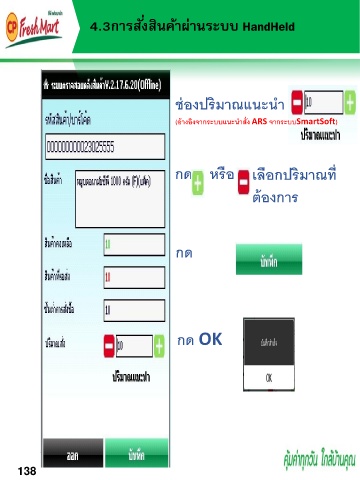 4.3กำรสั่งสินค้ำผ่ำนระบบ HandHeld ช่องปริมาณแนะน า (อ้างอิงจากระบบแนะน าสั่ง ARS จากระบบSmartSoft) กด หรือ เลือกปริมาณที่ ต้องการ กด กด OK 138