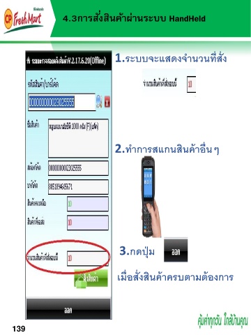 4.3กำรสั่งสินค้ำผ่ำนระบบ HandHeld 1.ระบบจะแสดงจ านวนที่สั่ง 2.ท าการสแกนสินค้าอื่นๆ 3.กดปุ่ม เมื่อสั่งสินค้าครบตามต้องการ 139