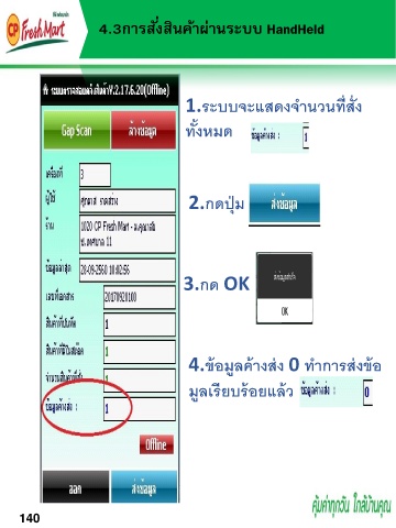 4.3กำรสั่งสินค้ำผ่ำนระบบ HandHeld 1.ระบบจะแสดงจ านวนที่สั่ง ทั้งหมด 2.กดปุ่ม 3.กด OK 4.ข้อมูลค้างส่ง 0 ท าการส่งข้อ มูลเรียบร้อยแล้ว 140