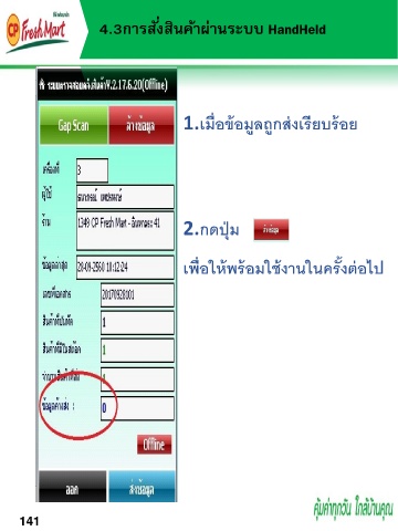 4.3กำรสั่งสินค้ำผ่ำนระบบ HandHeld 1.เมื่อข้อมูลถูกส่งเรียบร้อย 2.กดปุ่ม เพื่อให้พร้อมใช้งานในครั้งต่อไป 141