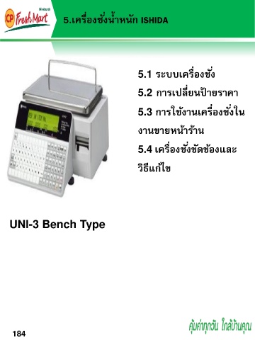 5.เครื่องชั่งน ้ำหนัก ISHIDA 5.1 ระบบเครื่องชั่ง 5.2 กำรเปลี่ยนป้ ำยรำคำ 5.3 กำรใช้งำนเครื่องชั่งใน งำนขำยหน้ำร้ำน 5.4 เครื่องชั่งขัดข้องและ วิธีแก้ไข UNI-3 Bench Type 184