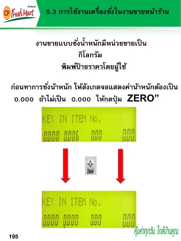 5.3 กำรใช้งำนเครื่องชั่งในงำนขำยหน้ำร้ำน งำนขำยแบบชั่งน ้ำหนักมีหน่วยขำยเป็น กิโลกรัม” พิมพ์ป้ ำยรำคำโดยผู้ใช้ ก่อนทำกำรชั่งน้ำหนัก ให้สังเกตจอแสดงค่ำน้ำหนักต้องเป็น “0.000” ถ้ำไม่เป็น “0.000” ให้กดปุ่ ม “ZERO” 195