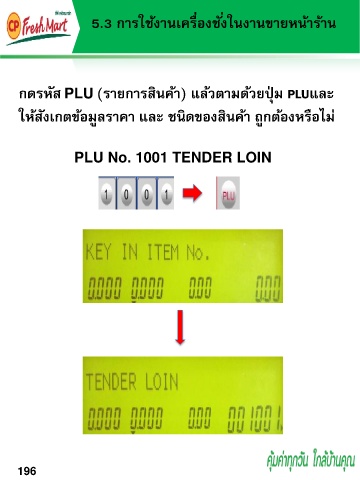 5.3 กำรใช้งำนเครื่องชั่งในงำนขำยหน้ำร้ำน กดรหัส PLU (รำยกำรสินค้ำ) แล้วตำมด้วยปุ่ ม PLUและ ให้สังเกตข้อมูลรำคำ และ ชนิดของสินค้ำ ถูกต้องหรือไม่ PLU No. 1001 TENDER LOIN 196