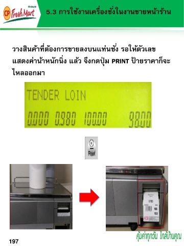 5.3 กำรใช้งำนเครื่องชั่งในงำนขำยหน้ำร้ำน วำงสินค้ำที่ต้องกำรขำยลงบนแท่นชั่ง รอให้ตัวเลข แสดงค่ำน้ำหนักนิ่ง แล้ว จึงกดปุ่ ม PRINT ป้ ำยรำคำก็จะ ไหลออกมำ 197