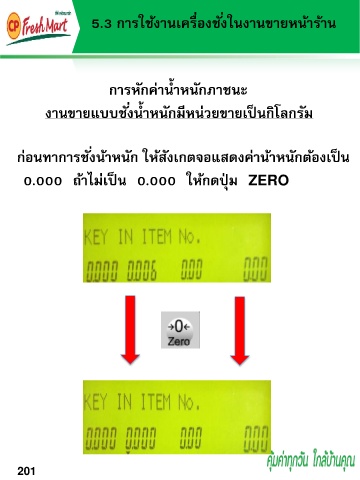 5.3 กำรใช้งำนเครื่องชั่งในงำนขำยหน้ำร้ำน กำรหักค่ำน ้ำหนักภำชนะ งำนขำยแบบชั่งน ้ำหนักมีหน่วยขำยเป็นกิโลกรัม ก่อนทำกำรชั่งน้ำหนัก ให้สังเกตจอแสดงค่ำน้ำหนักต้องเป็น “0.000” ถ้ำไม่เป็น “0.000” ให้กดปุ่ ม “ZERO 201