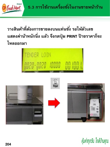 5.3 กำรใช้งำนเครื่องชั่งในงำนขำยหน้ำร้ำน วำงสินค้ำที่ต้องกำรขำยลงบนแท่นชั่ง รอให้ตัวเลข แสดงค่ำน้ำหนักนิ่ง แล้ว จึงกดปุ่ ม PRINT ป้ ำยรำคำก็จะ ไหลออกมำ 204