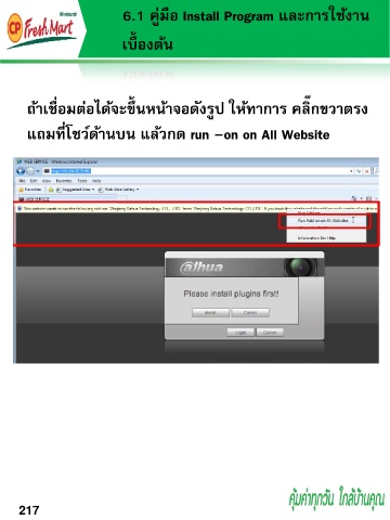 6.1 คู่มือ Install Program และกำรใช้งำน เบื้ องต้น ถ้ำเชื่อมต่อได้จะขึ้ นหน้ำจอดังรูป ให้ทำกำร คลิ๊กขวำตรง แถมที่โชว์ด้ำนบน แล้วกด run –on on All Website 217