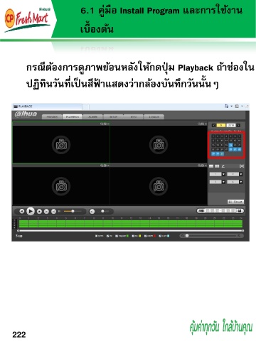6.1 คู่มือ Install Program และกำรใช้งำน เบื้ องต้น กรณีต้องกำรดูภำพย้อนหลังให้กดปุ่ ม Playback ถ้ำช่องใน ปฏิทินวันที่เป็นสีฟ้ ำแสดงว่ำกล้องบันทึกวันนั้นๆ 222