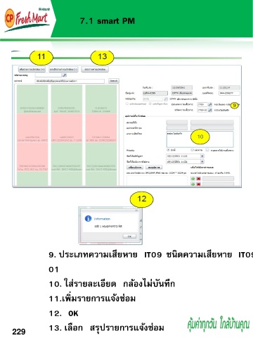 7.1 smart PM 9. ประเภทควำมเสียหำย “IT09”ชนิดควำมเสียหำย “IT09- 01” 10. ใส่รำยละเอียด “กล้องไม่บันทึก” 11.เพิ่มรำยกำรแจ้งซ่อม 12. “OK” 229 13. เลือก “สรุปรำยกำรแจ้งซ่อม”
