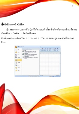 6 ปุ่ม Microsoft Office ปุ่ม Microsoft Office คือ ปุ่มที่ใช้ควบคุมค าสั่งหลักเกี่ยวกับการสร้างแฟ้มการ เปิดแฟ้มการบันทึกการบันทึกเป็นการ พิมพ์ การส่ง การจัดเตรียม การประกาศ การปิด เอกสารลาสุด และตัวเลือก ของ Excel
