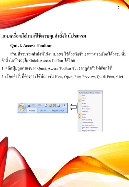 1. คลิกปุ่มลูกศรลงของ Quick Access Toolbar จะปรากฏค าสั่งให้เลือกใช้
