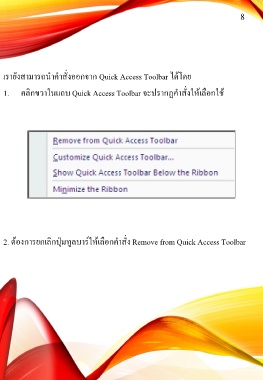 8 เรายังสามารถน าค าสั่งออกจาก Quick Access Toolbar ได้โดย 1. คลิกขวาในแถบ Quick Access Toolbar จะปรากฏค าสั่งให้เลือกใช้ 2. ต้องการยกเลิกปุ่มทูลบาร์ให้เลือกค าสั่ง Remove from Quick Access Toolbar