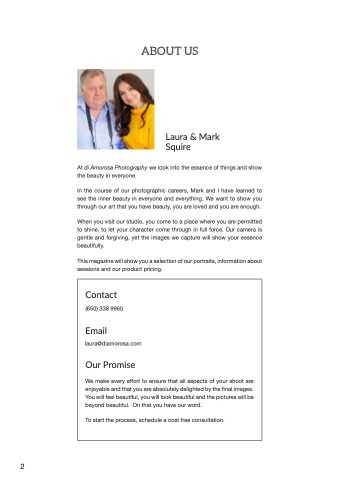 At di Amorosa Photography we look into the the essence of things and show the beauty in everyone In the the course of our our photographic careers Mark and and I I have learned to to to see the the inner beauty beauty in in in everyone and and and everything We want to to to show you you you you through our art that you you you you have beauty beauty you you you you are are loved and and you you you you are are enough When you you you you visit our our studio you you you you come come to to to a a a a a a a place where you you you you are permitted to to to shine to to to let your your character come come through in in in full force Our camera is is gentle and forgiving yet the images we capture will show your your essence beautifully This magazine will show you a a a a a a a selection of our our portraits information about sessions and our product pricing Contact