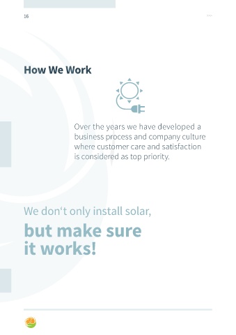 16 >>> How We Work Over the years we have developed a business process and company culture where customer care and satisfaction is considered as top priority. We don‘t only install solar, but make sure it works!