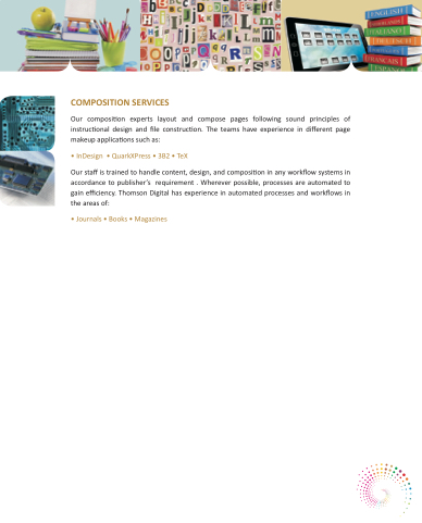 Our composi on experts layout and compose pages following sound principles of instruc onal design and le construc on. The teams have experience in di erent page makeup applica ons such as: