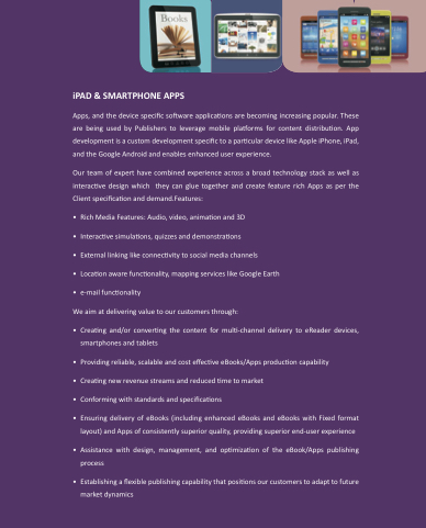 • Providing reliable, scalable and cost e ec ve eBooks/Apps produc on capability