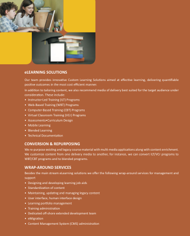 We re-purpose exis ng and legacy course material with mul -media applica ons along with content enrichment. We customize content from one delivery media to another, for instance, we can convert ILT/VCr programs to WBT/CBT programs and to blended programs.