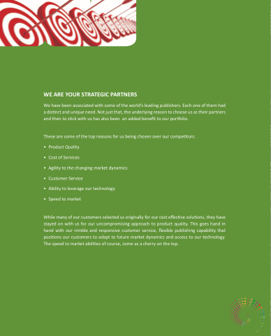 While many of our customers selected us originally for our cost e ec ve solu ons, they have stayed on with us for our uncompromising approach to product quality. This goes hand in hand with our nimble and responsive customer service, exible publishing capability that posi ons our customers to adapt to future market dynamics and access to our technology. The speed to market abili es of course, come as a cherry on the top.