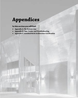Appendices In this section you will find: ◆ Appendix A: The Bottom Line ◆ Appendix B: Tips, Tricks, and Troubleshooting ◆ Appendix C: Autodesk Revit Architecture Certification bapp01.indd 867 5/3/2014 12:11:30 PM