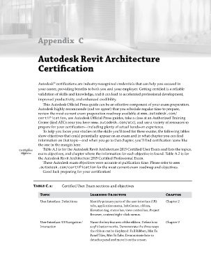 Certification Table A.1 is for the Autodesk Revit Architecture 2015 Certified User Exam and lists the topics,