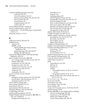 glazed panels, 504, 514, 651, 662 Group And Associate option, 79, 80, 322, 619, 870